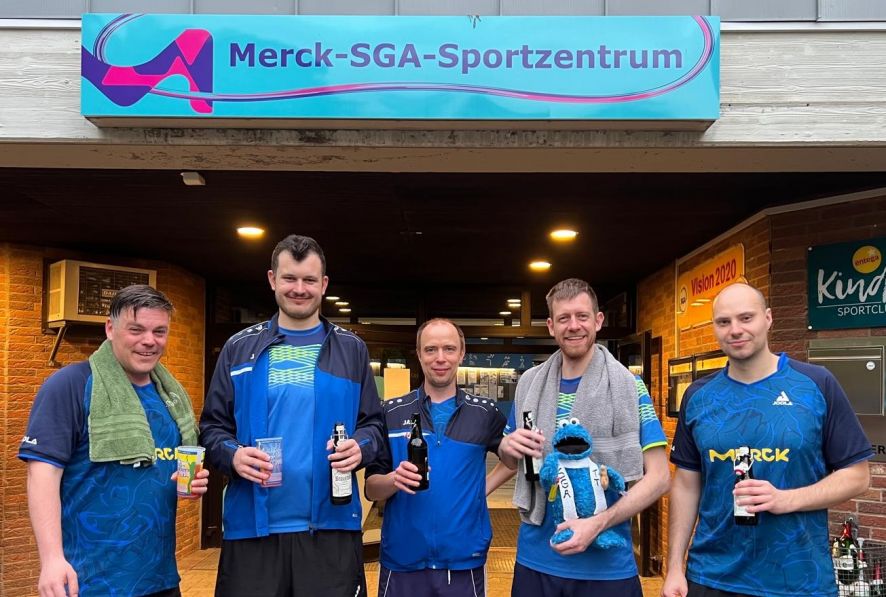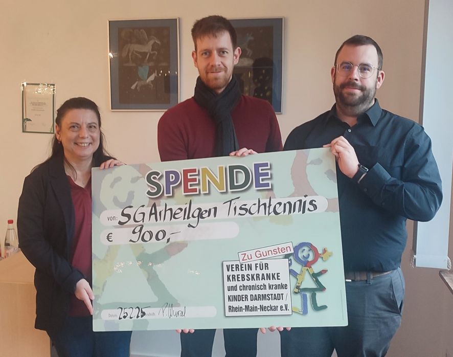 Nach Abschluss des Turniers traf man sich abends dann in zwangloser Runde bei leckerem Essen und Trinken im Jugendraum des Merck-SGA-Sportzentrums – und auch dort wurde weiterhin fleißig Geld für den guten Zweck gesammelt. Somit kamen am Ende des Tages erfreulicherweise 900,00 Euro zusammen. Vielen Dank dafür an alle Spender/innen! Dieser Betrag wurde sodann am 25.02.2025 von unserem Abteilungsleiter Patrick Wurzel und unserem Rechner Jan Seemann dem VKKD in deren Geschäftsräumen in Darmstadt überreicht.